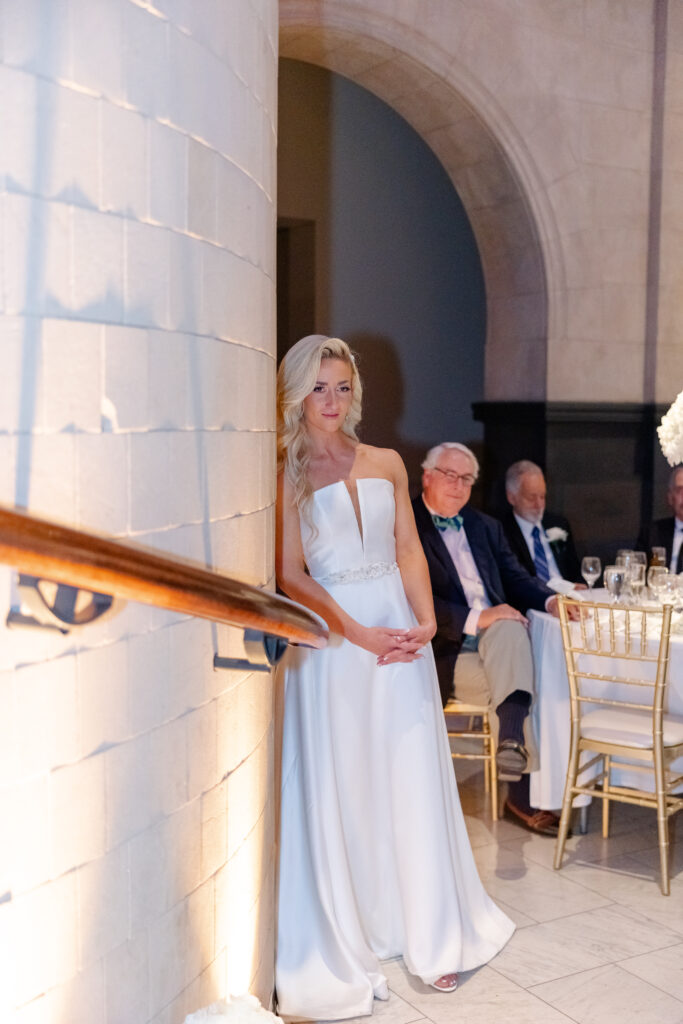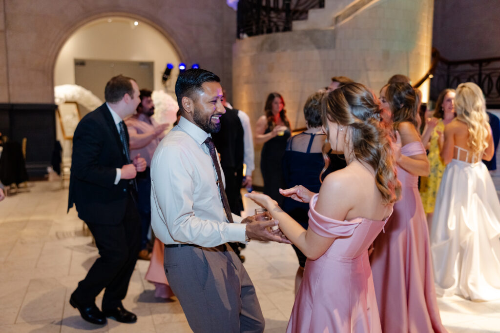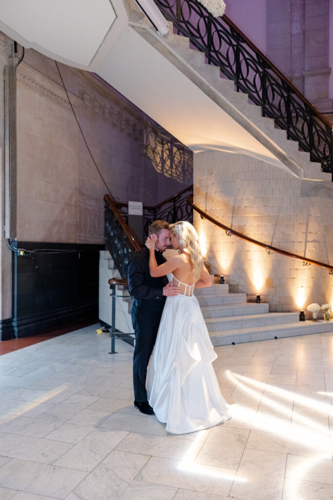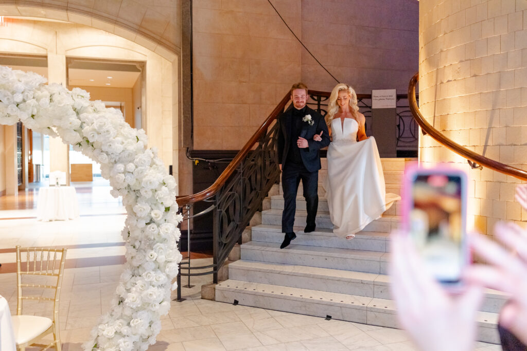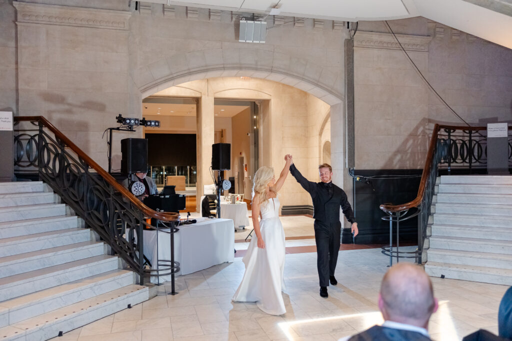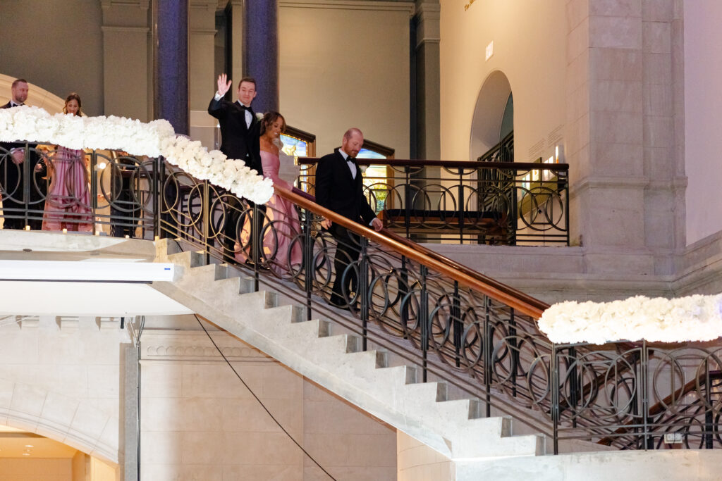 The indoor ballroom at the Cincinnati Art Museum is nothing short of breathtaking. With its soaring ceilings and sweeping double staircase, it sets the stage for unforgettable moments. Couples making their entrance down those stairs create a cinematic, regal beginning to the evening.