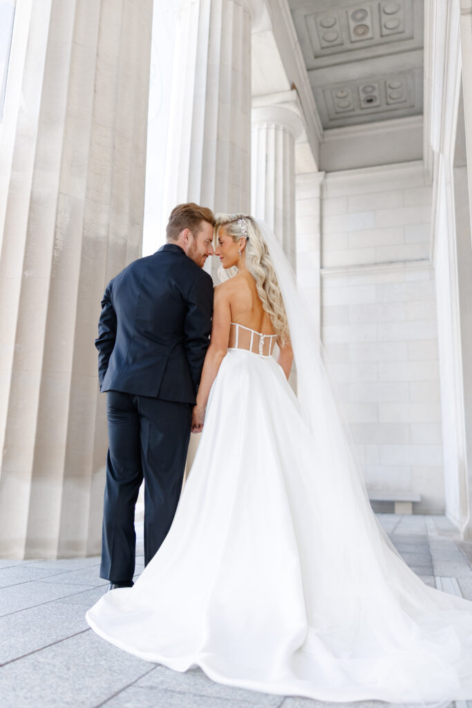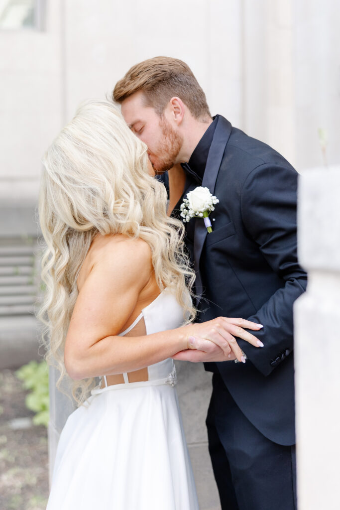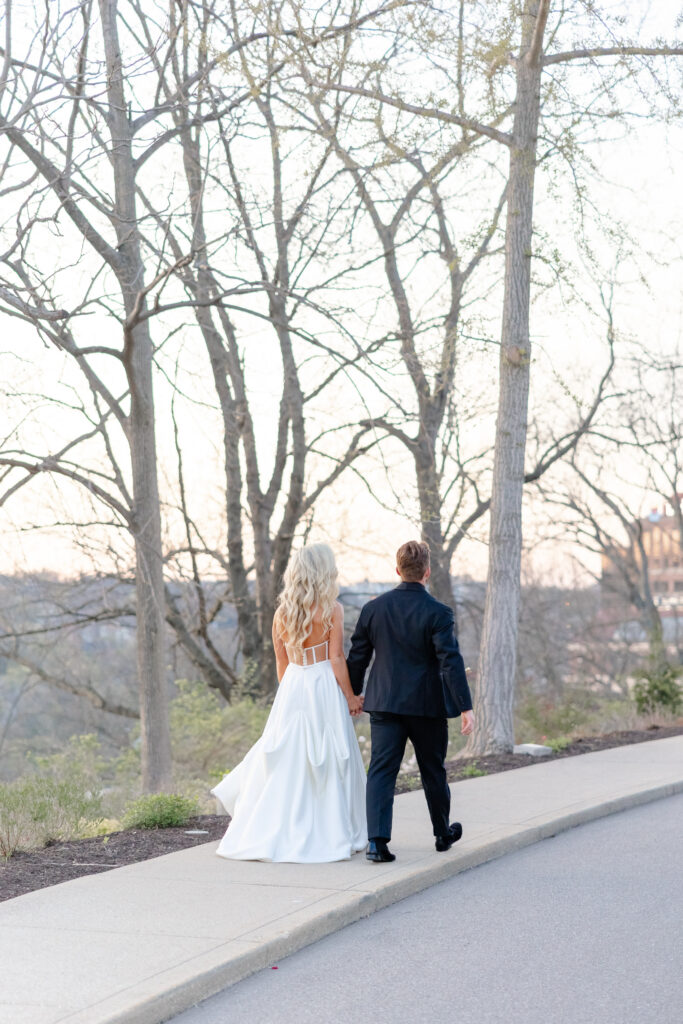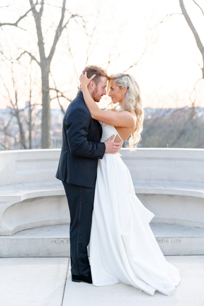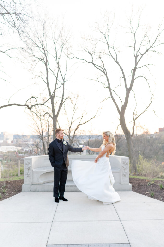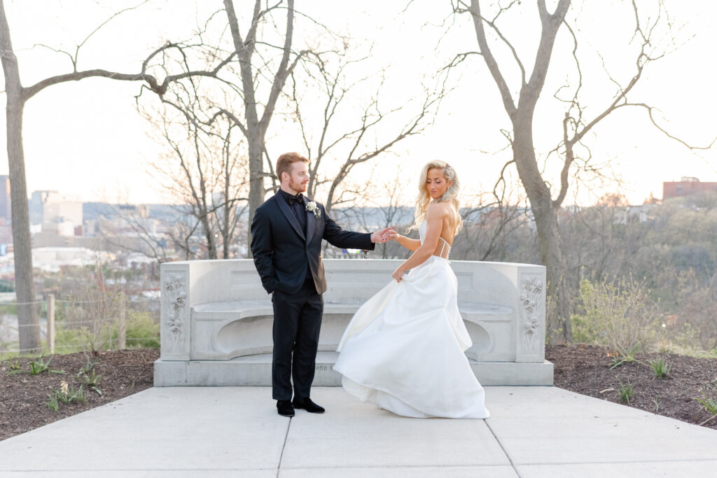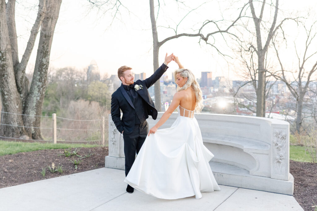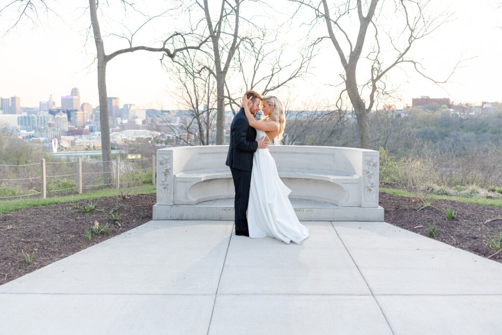 One of our favorite parts of a Cincinnati Art Museum wedding is sneaking outside during golden hour. The museum’s exterior glows beautifully at sunset, creating the kind of warm, romantic portraits couples dream about. Just steps away, there’s also a lookout point with sweeping views over the entire city of Cincinnati – the perfect backdrop to capture both the intimacy of the moment and the grandeur of the skyline. It’s a quiet pause in the celebration, and the kind of memory that will live on every time you look back at your photos.